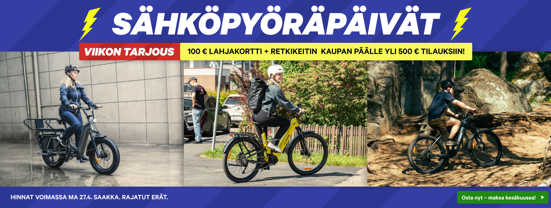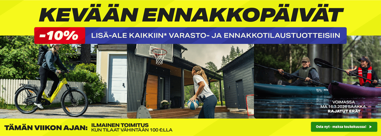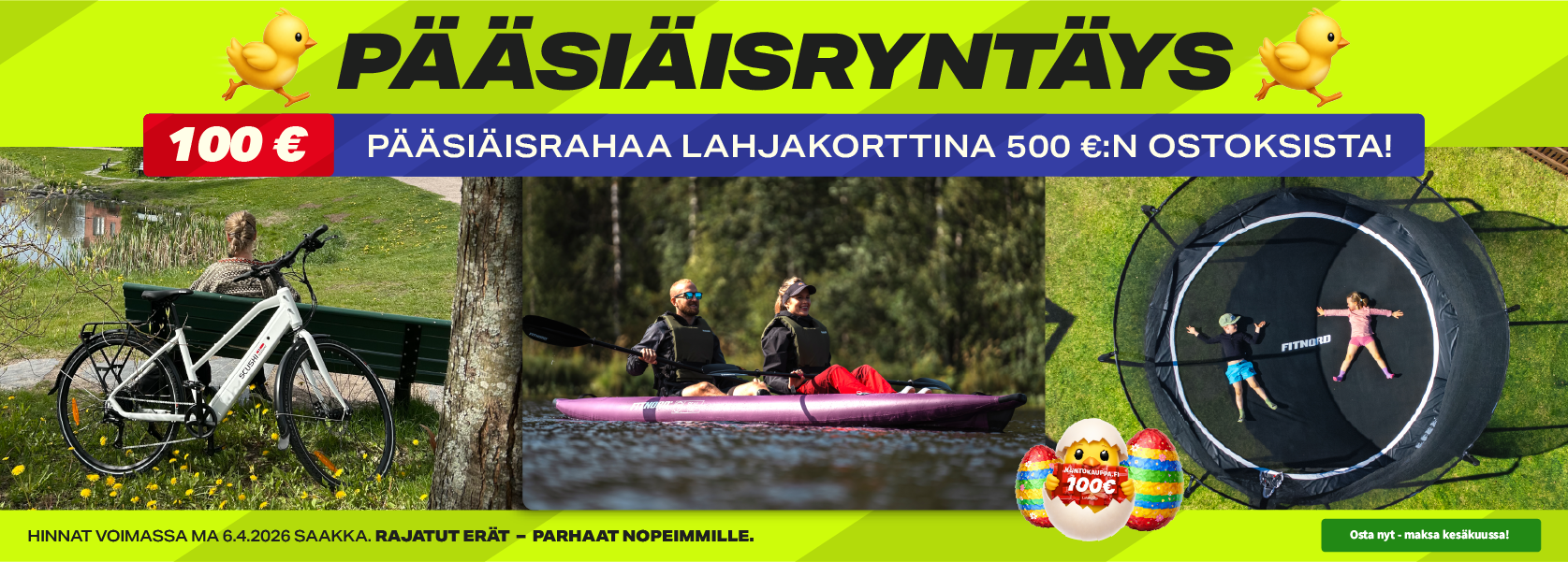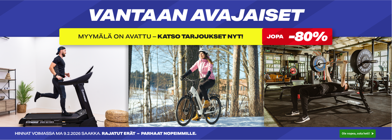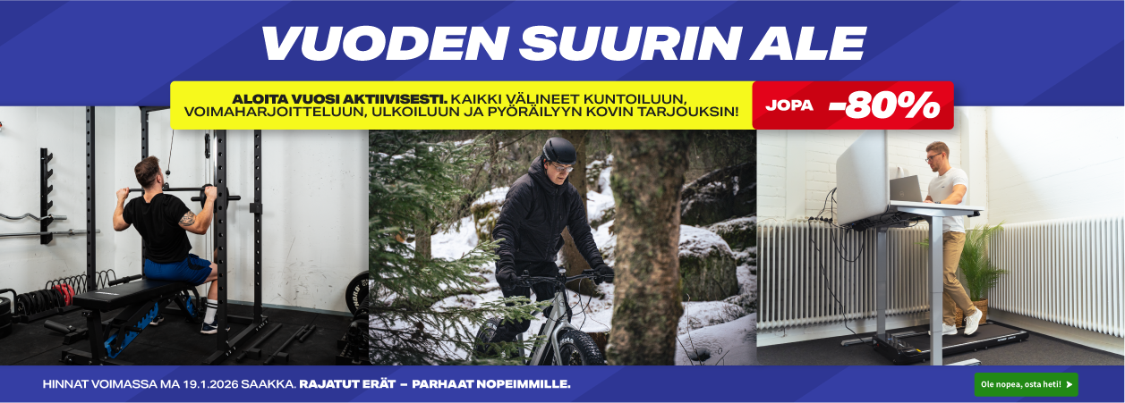 Kuntokauppa.fi on suomalainen kuntoilun ja sähköpyöräilyn erikoisliike, joka on palvellut suomalaisia kuntoilijoita, yrityksiä ja seuroja jo yli 14 vuotta. Yli 3500 tuotteen valikoimasta löydät laadukkaat muun muassa sähköpyörät, sähkömaastopyörät, sähköfatbiket, kajakit, sup-laudat, trampoliinit, juoksumatot, kuntopyörät, crosstrainerit, soutulaitteet, kajakit sekä kattavan valikoiman kotitreenivälineitä ja kehonhuoltotuotteita. Valikoimastamme löydät lisäksi yritys- ja ammattikäyttöön suunnitellut kuntosalilaitteet ja -välineet.