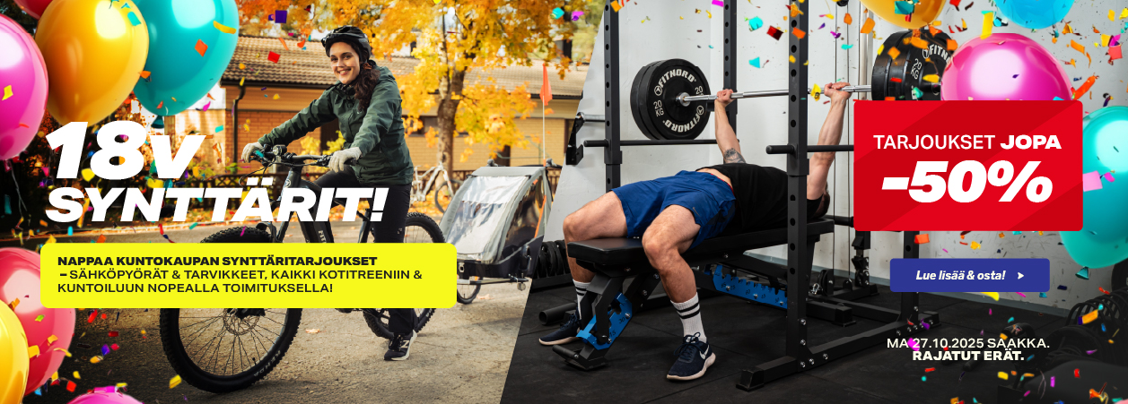 Kuntokauppa.fi on suomalainen kuntoilun ja sähköpyöräilyn erikoisliike, joka on palvellut suomalaisia kuntoilijoita, yrityksiä ja seuroja jo yli 14 vuotta. Yli 3500 tuotteen valikoimasta löydät laadukkaat muun muassa sähköpyörät, sähkömaastopyörät, sähköfatbiket, kajakit, sup-laudat, trampoliinit, juoksumatot, kuntopyörät, crosstrainerit, soutulaitteet, kajakit sekä kattavan valikoiman kotitreenivälineitä ja kehonhuoltotuotteita. Valikoimastamme löydät lisäksi yritys- ja ammattikäyttöön suunnitellut kuntosalilaitteet ja -välineet.