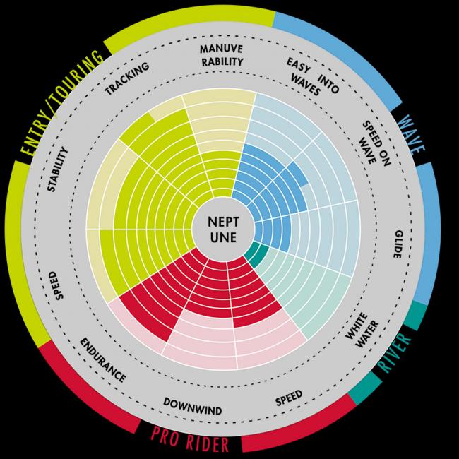 Neptunen footpadi on 5 mm paksua EVA-vaahtomuovia, joka tuntuu mukavata jalkojen alla pidemmälläkin matkalla, eikä lipsu. Lisäksi Neptunessa on takana ylimääräinen jalkatuki, josta saa kovemmissa vedoissa otettua tukea. Laudan etuosassa on säilytystilaa esimerkiksi eväille, vesipullolle ja muille tarvikkeille. Tavarat pysyvät tukevasti paikoillaan joustavan remmin alla.