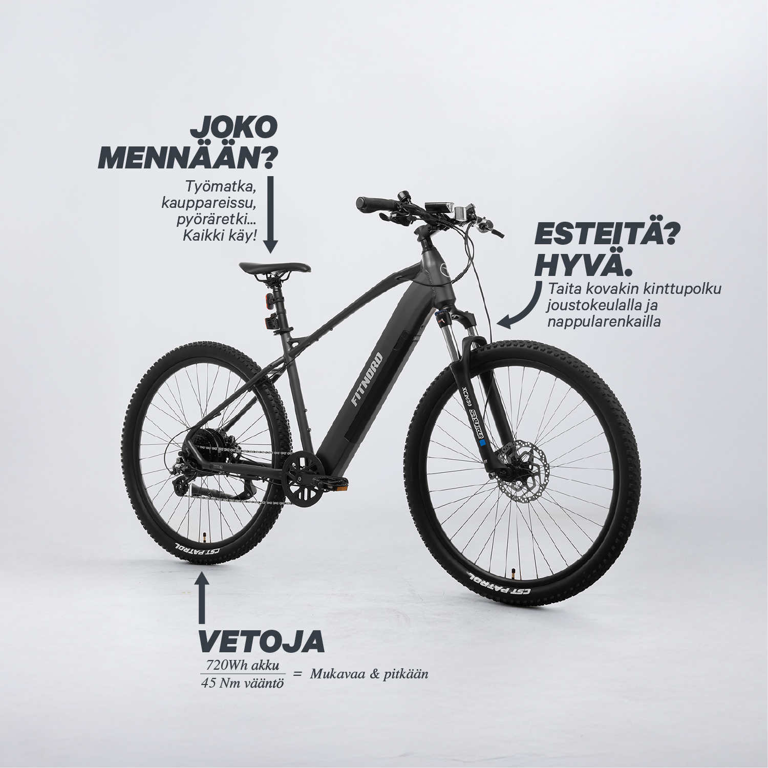 - Pitävät CST Patrol -renkaat – Tarjoavat tehokasta pitoa maastossa, mutta rullaavat kevyesti myös asfaltilla.