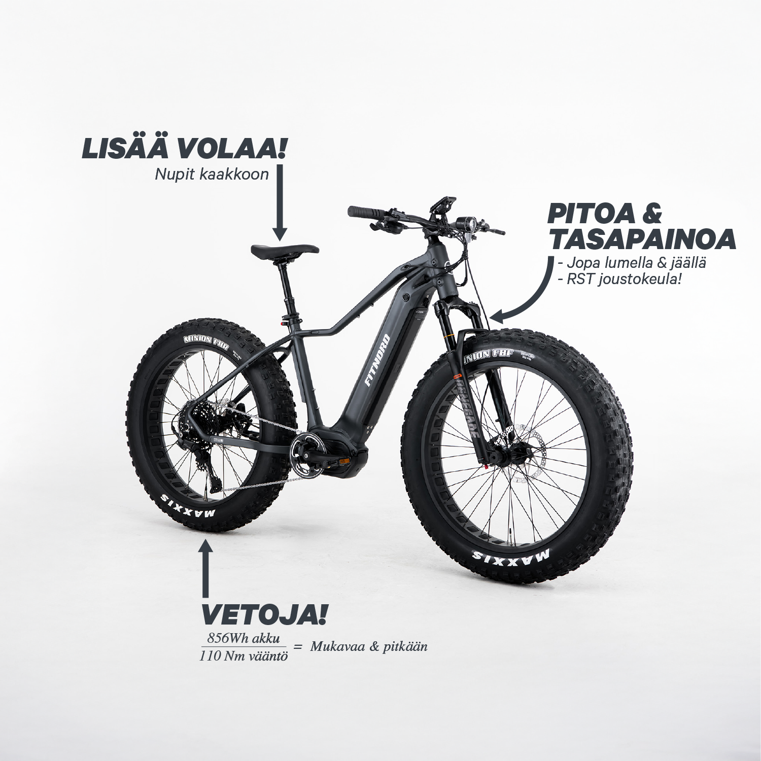 - Leveät 4,8” renkaat – Maxxis Minion FBF/FBR 4,8” -renkaiden iso nappulakuviointi tarjoaa erinomaisen pidon hiekalla, lumessa ja loskassa.