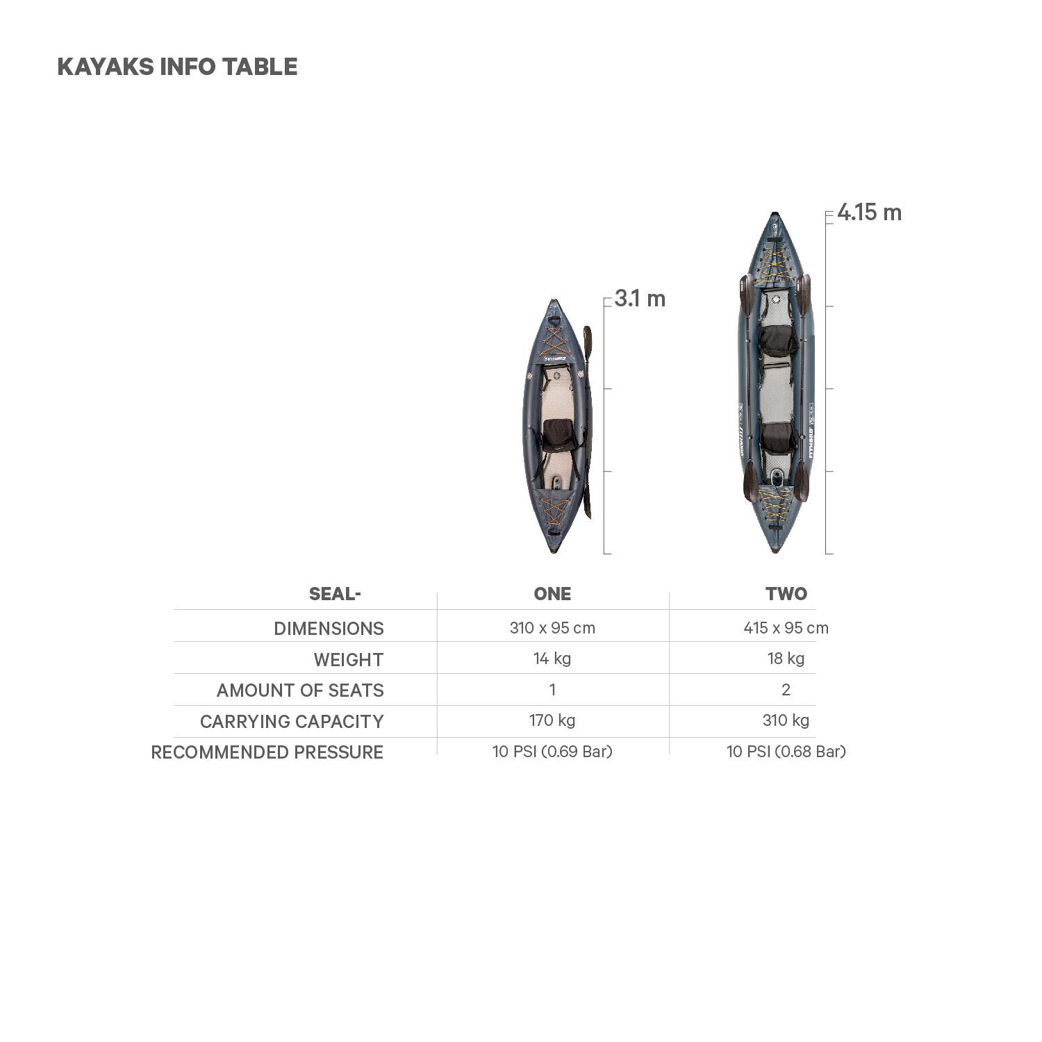 Ilmatäytteinen kajakki sopii kaikille, sillä se ei vaadi pysyvää kajakkipaikkaa tai suurta säilytystilaa. Vakautensa ansiosta FitNord Seal One on hyvä valinta myös aloitteleville melojille, ja sen monipuolinen varustelu takaa nautinnolliset melontahetket. Jos hetket muuttuvat pidemmiksi retkiksi, kajakissa on paljon säilytystilaa tavaroiden kuljetusta varten. Kajakki mahtuu pieneenkin varastoon ja sitä on helppo kuljettaa.