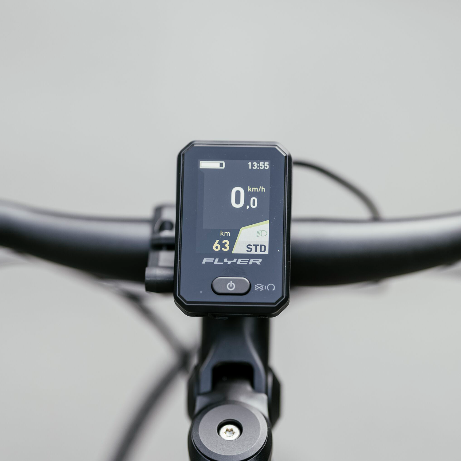 28” Schwalbe Big Ben renkaat takaavat pienen vierintävastuksen, mutta tehokkaan pidon alustalla kuin alustalla. Laadukas 9-vaihteinen Shimano Alivio -vaihteisto tekee polkemisesta tasaista ja miellyttävää. Hydrauliset Shimano MT402, 180/180 mm -levyjarrut pitävät huolta, että sähköpyörä pysähtyy varmasti, heti kun haluat. Flyer Upstreet5 5.10 sähköpyörän ohjausyksikkönä toimii helppolukuinen FLYER D0 2” värinäyttö, jota on todella helppo käyttää ajon aikana.