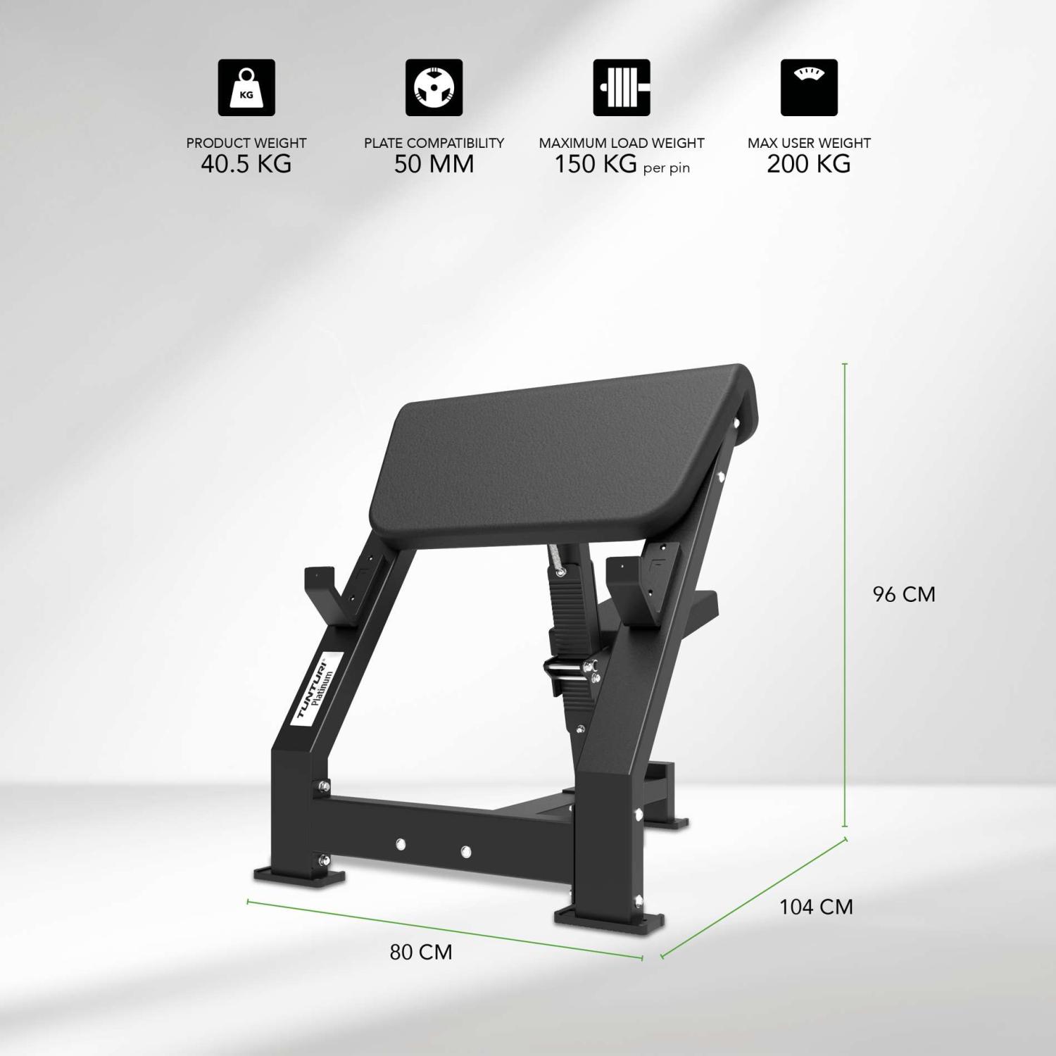 Laite on suunniteltu mukavuutta ja turvallisuutta silmällä pitäen. Säädettävä istuin ja kulmattu käsituki tukevat oikeaa asentoa, ja tukeva runkorakenne takaa laitteen vakauden myös raskaissa sarjoissa. Pehmeät PU-pehmusteet lisäävät käyttömukavuutta ja kestävät intensiivistä käyttöä. Telineessä on myös käytännölliset levypainotelineet, jotka pitävät painot aina helposti saatavilla.